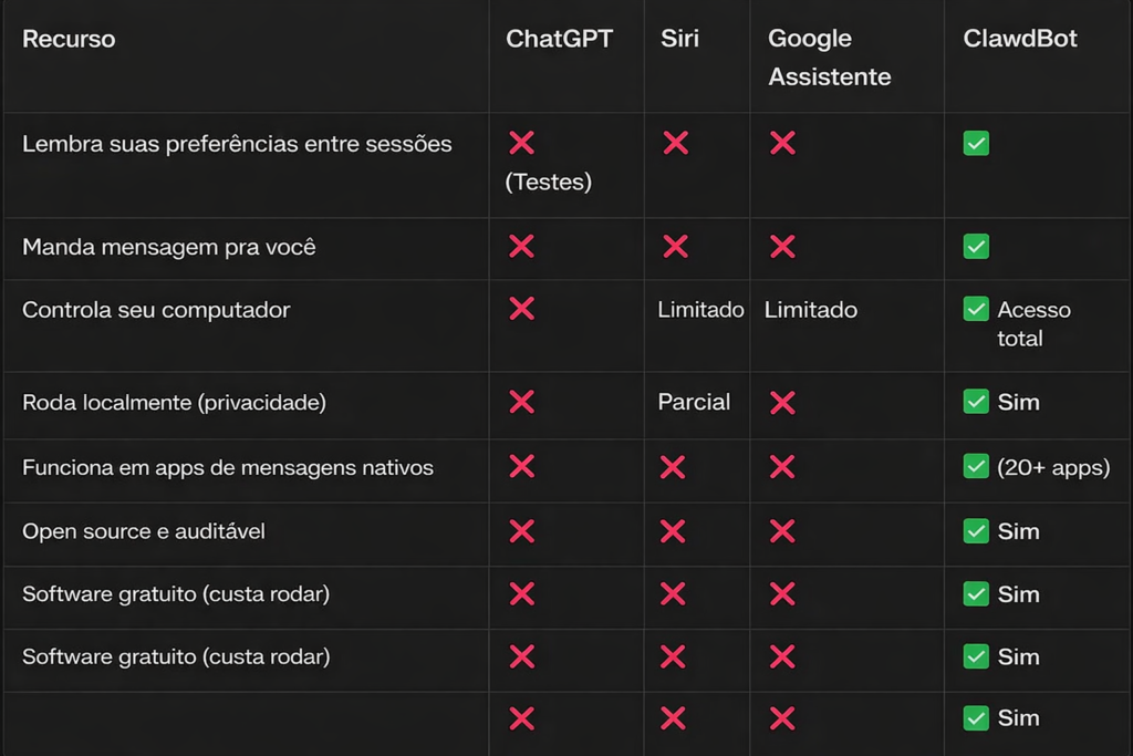 Em 2026, o conceito tradicional de assistente de IA está sendo redefinido. Ferramentas como ChatGPT ou assistentes de voz (Siri, Google Assistant) respondem a comandos isolados, mas não executam tarefas reais de forma contínua ou lembram contexto ao longo do tempo. ClawdBot é diferente: ele é um assistente de inteligência artificial que você pode hospedar em sua própria infraestrutura ou servidor, que executa tarefas reais de automação, lembra preferências, atua proativamente e opera via seus aplicativos de mensagens do dia a dia — como Telegram, WhatsApp ou Slack — transformando IA de um recurso reativo em um trabalhador digital que entrega resultados tangíveis.