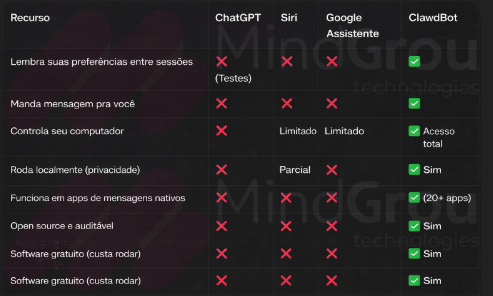Em 2026, o conceito tradicional de assistente de IA está sendo redefinido. Ferramentas como ChatGPT ou assistentes de voz (Siri, Google Assistant) respondem a comandos isolados, mas não executam tarefas reais de forma contínua ou lembram contexto ao longo do tempo. ClawdBot é diferente: ele é um assistente de inteligência artificial que você pode hospedar em sua própria infraestrutura ou servidor, que executa tarefas reais de automação, lembra preferências, atua proativamente e opera via seus aplicativos de mensagens do dia a dia — como Telegram, WhatsApp ou Slack — transformando IA de um recurso reativo em um trabalhador digital que entrega resultados tangíveis.